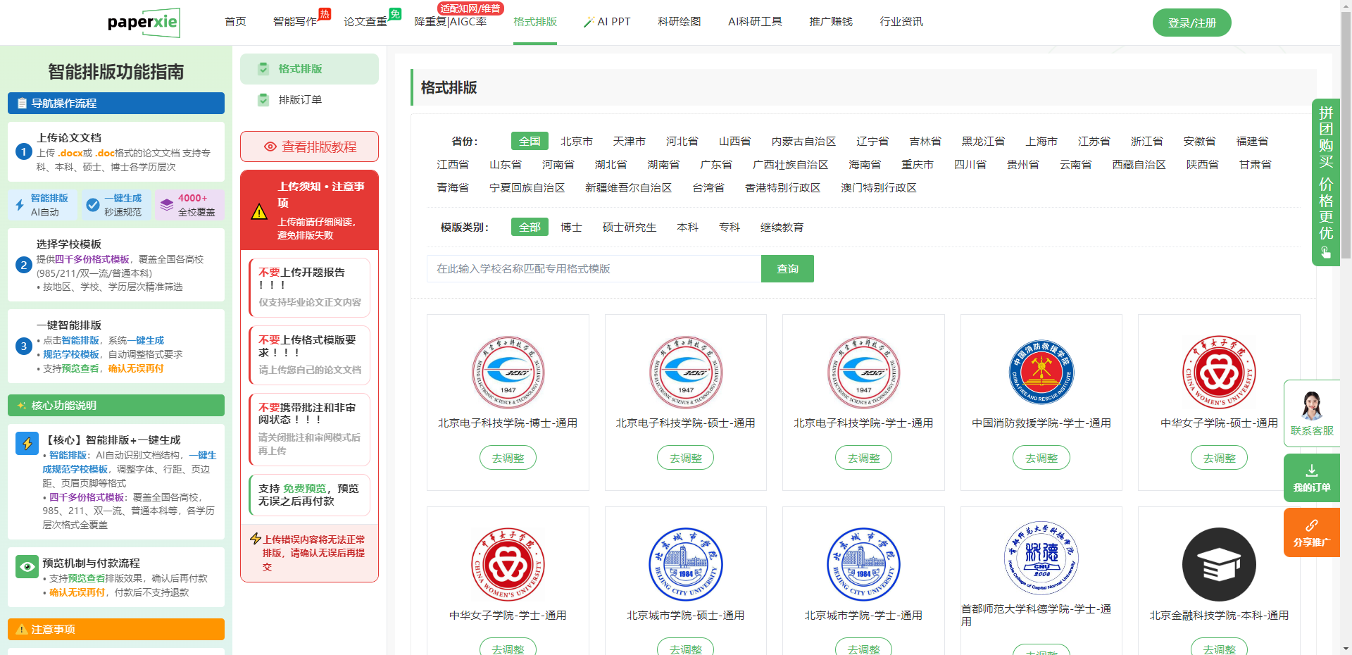Paperxie 的格式排版功能,最核心的优势就是覆盖全国 4000 + 高校的专属格式模板,从 985、211 双一流院校到普通本科、专科,从博士、硕士到本科、继续教育,每一所学校、每一个学历层次都有对应的定制模板。这些模板严格按照各校最新发布的论文格式要求制作,定期更新迭代,确保字体、字号、行间距、页边距、页眉页脚等每一个细节都精准匹配。用户无需再对着繁杂的格式要求逐一研究,只需要在 Paperxie 的模板库中选择自己的省份、学校和学历层次,就能一键匹配专属模板,彻底告别通用模板的适配难题。操作界面设计得极其简洁,左侧是清晰的操作导航,右侧是模板展示区,哪怕是第一次使用的新手,也能在 3 秒内找到自己需要的模板,完全没有学习成本。