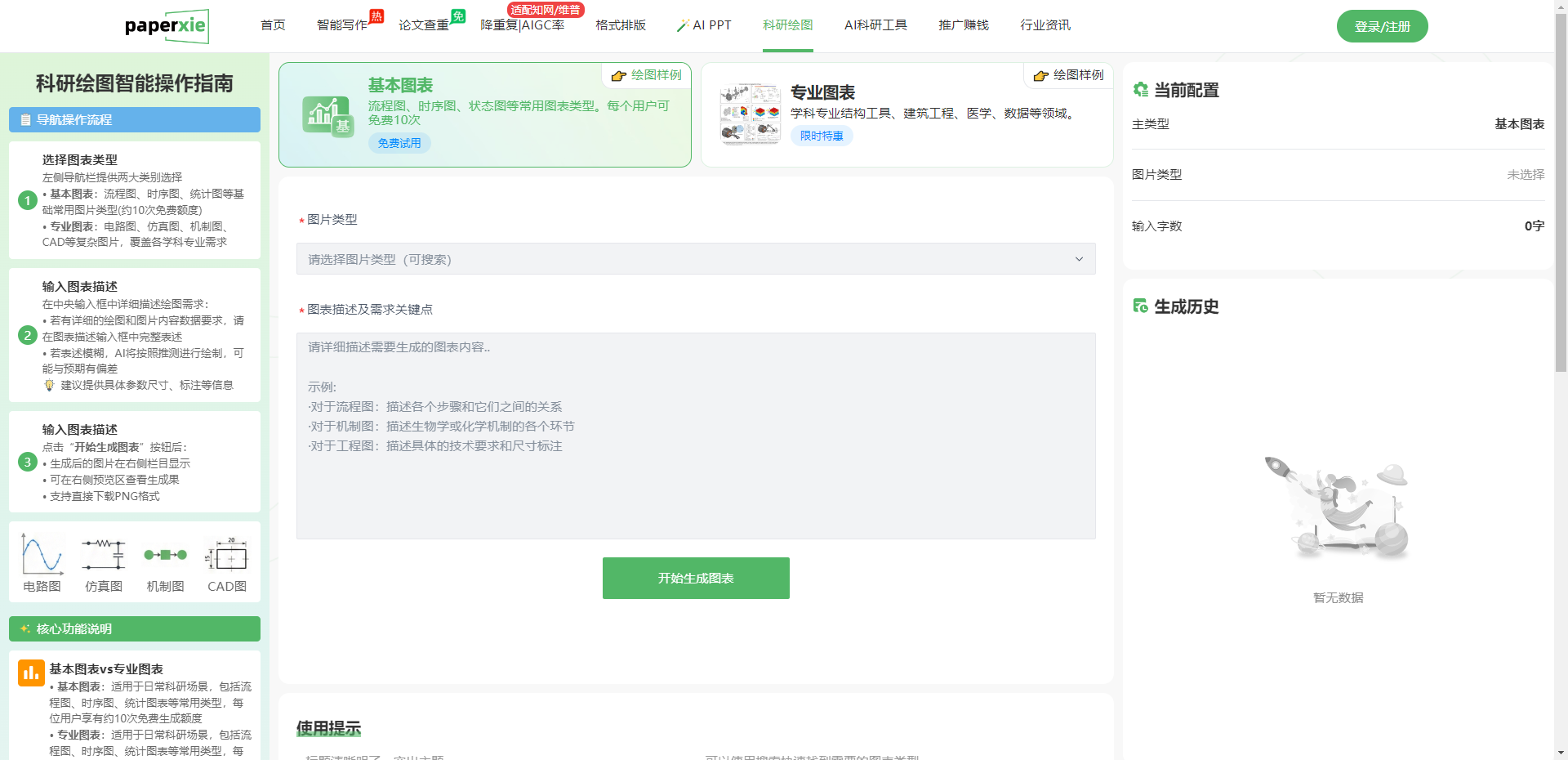 当你登录 Paperxie 官网,点击顶部导航栏的 “科研绘图” 按钮,就能直接进入 AI 科研绘图的操作页面。整个页面布局清晰、逻辑分明,左侧是导航操作流程和核心功能说明,中间是绘图操作区,右侧是当前配置和生成历史,就算是第一次使用,也能快速上手。